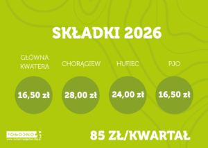 AktualnościWażne Nowa składka członkowska 2026 15 września 2025 Karolina Gabryś 380 Views Informujemy, że od 2026 roku składka członkowska w ZHP wzrośnie do 85 zł Będzie to wyglądać w taki sposób w tym momencie: Główna Kwatera ZHP – 16,50 zł Chorągiew Zachodniopomorska – 28,00 zł Hufiec Szczecin-Pogodno ZHP – 24,00 zł drużyna/gromada – 16,50 zł zgodnie z Uchwałą 5/2025 Rady Chorągwi Zachodniopomorskiej z dnia 29 września 2025